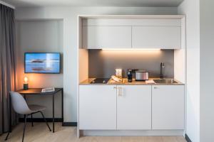 Each studio apartment comes with one bed and includes a well-equipped kitchen featuring a stovetop, refrigerator, dishwasher, microwave, toaster, coffee machine and electric kettle. Guests will find a private bathroom with either a bathtub or shower along with a hairdryer and body soap. Additional room amenities include heating, wardrobe or closet space, safe deposit box, work desk as well as flat-screen TV.