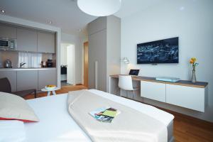 Każda kawalerka wyposażona jest w jedno łóżko oraz aneks kuchenny obejmujący płytę grzejną, lodówkę, zmywarkę, mikrofalówkę i ekspres do kawy - wszystko niezbędne do samodzielnego przygotowywania posiłków. Pokoje posiadają dźwiękoszczelne ściany oraz część wypoczynkową wyposażoną w telewizor satelitarny LCD i stację dokującą do iPoda. Prywatna łazienka zawiera prysznic oraz bezpłatne kosmetyki takie jak szampon i mydło do ciała, suszarkę do włosów i ręczniki. Dodatkowo pokoje są ogrzewane oraz wyposażone w sejfy na wartościowe przedmioty, biurka do pracy, szafy lub garderoby oraz łóżeczka dziecięce dostępne na życzenie.